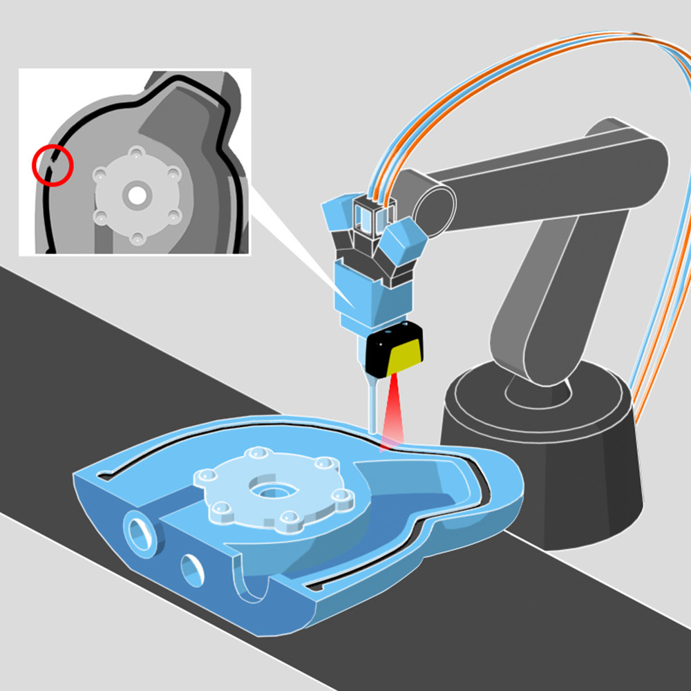 Applying a bead of sealant to a complex pump housing, prior to the next assembly operation needs to be carefully controlled. SmartRay 3D accurately guides the robot dispenser around the housing to ensure the correct placement of the sealant around the entire path.